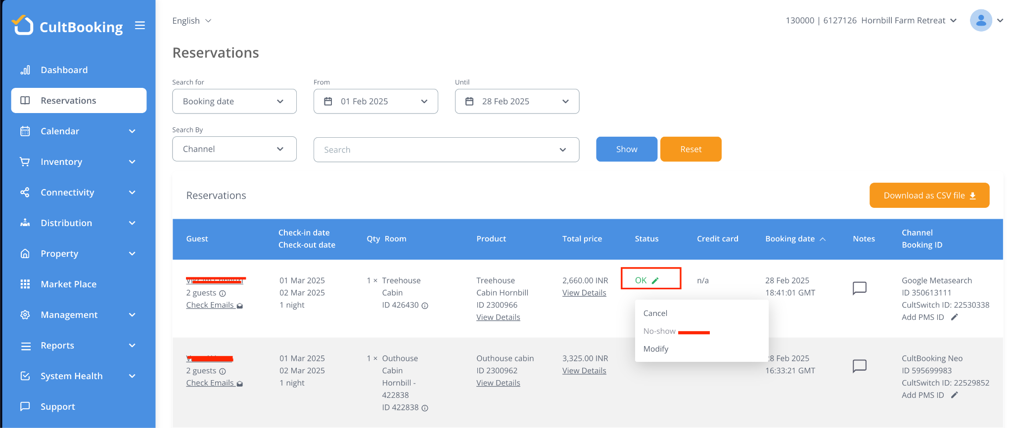 - Booking 980443915 — Cancelled on March 10 by Hornbill Farm Retreat (Reason: No response)